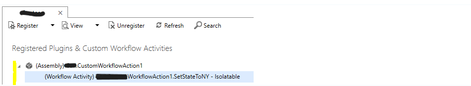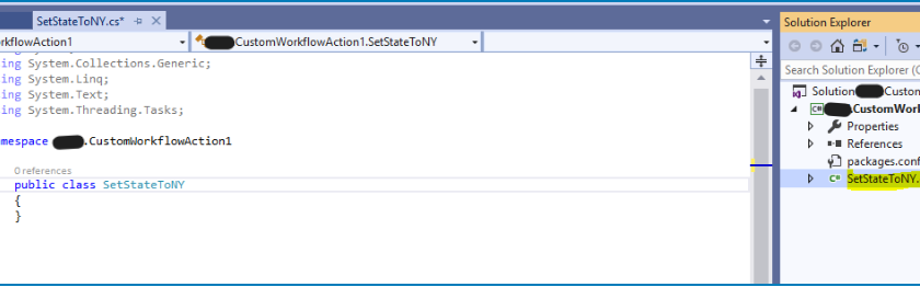 Change the code to below.using System; using System.Collections.Generic; using System.Linq; using System.Text; using System.Threading.Tasks; using System.Activities; using Microsoft.Xrm.Sdk; using Microsoft.Xrm.Sdk.Workflow; namespace powerappsninja.CustomWorkflowAction1 { public class SetStateToNY : CodeActivity { [RequiredArgument] [Input("String input")] public InArgument<string> CityInput { get; set; } [Output("String output")] public OutArgument<string> StateOutput { get; set; } protected override void Execute(CodeActivityContext context) { string city = CityInput.Get(context); if (city == "NYC") StateOutput.Set(context, "New York"); else StateOutput.Set(context, string.Empty); } } }