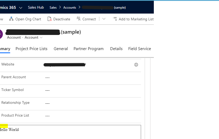 When a web resource is created in Dynamics 365 / Power Apps, we get a border defaulting around it. For example, below is a web resource on the Account form displaying “Hello World”. We see the border around the web resource: