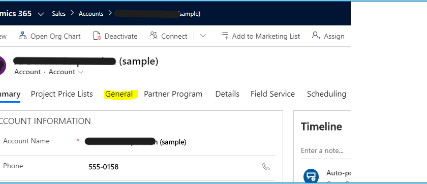 In our example, let’s look at the Account form. This form has multiple tabs – Summary, Project Price Lists, General etc. Let’s write code so when a user clicks in and out of the General tab, our code runs: